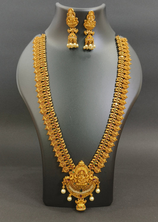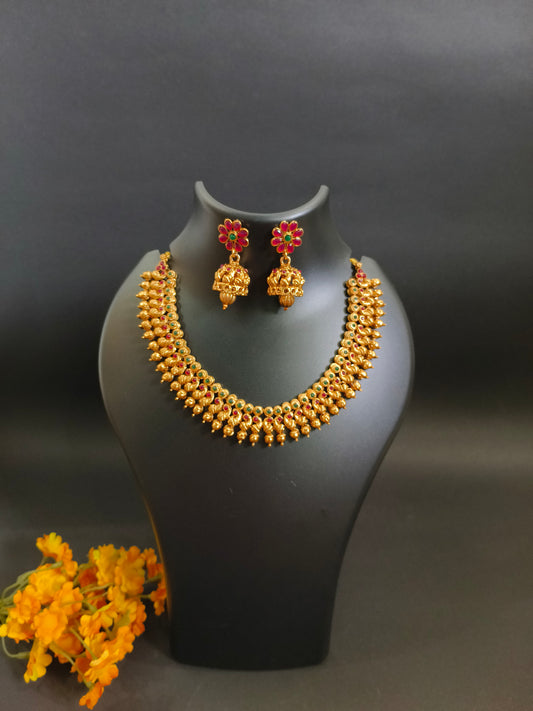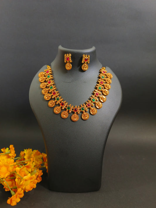 Antique Finish Multi Colour Kempu Necklace Set - Temple Jewelry Design