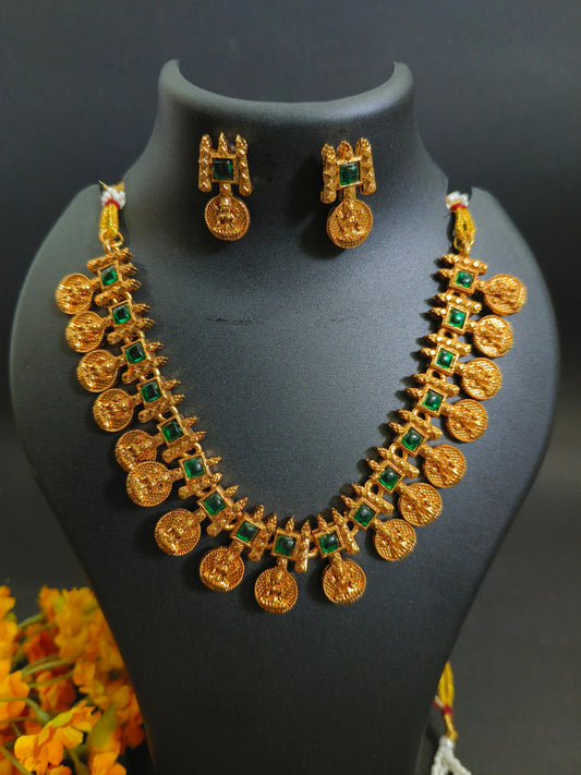 Antique Finish Green Kempu Necklace Set - Temple Jewelry Design