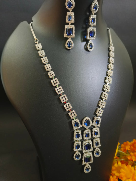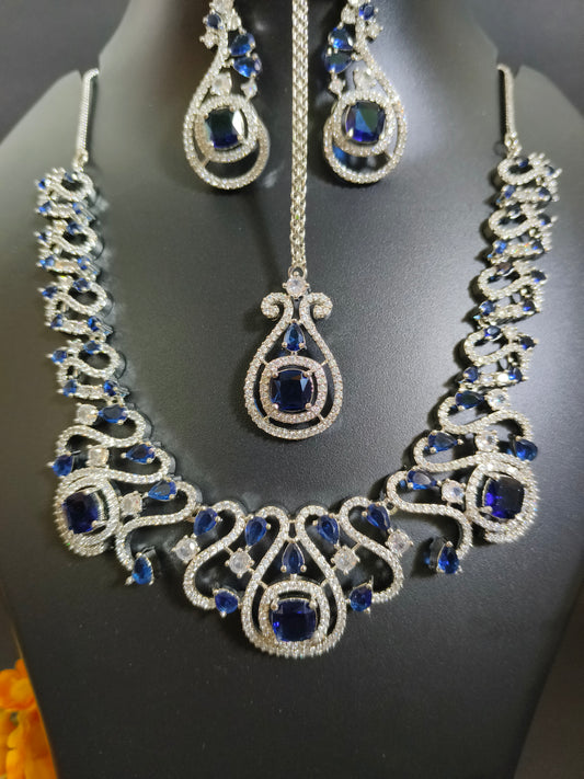 American Diamond Exquisite Necklace Set with Blue Stones & Maang Tikka