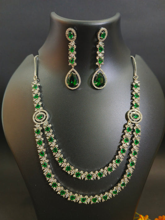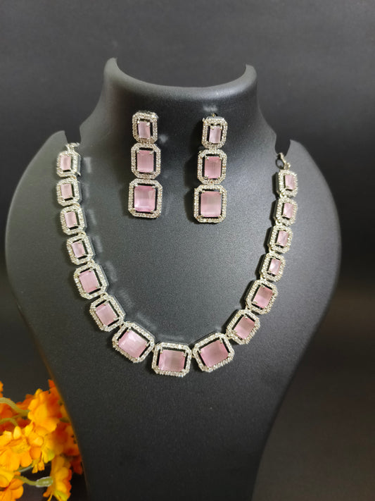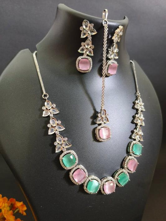 American Diamond Necklace Set with Pink & Green Stones & Maang Tikka