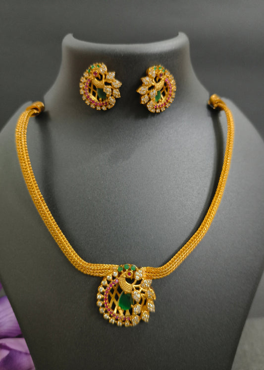 Pear-Shaped Green Crystal Necklace Set - Silver Tone with AD Stones