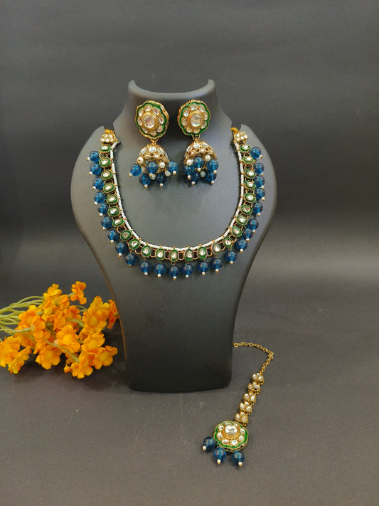 Gold Plated Kundan and Pearl Necklace Set with Earrings & Maang Tikka