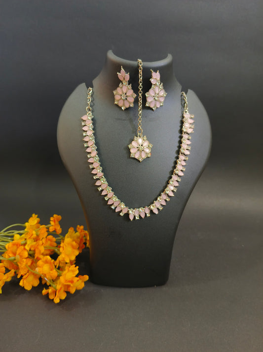 Princess Fancy Jewellery Set with Pink Stones - Necklace, Earrings & Maang Tikka