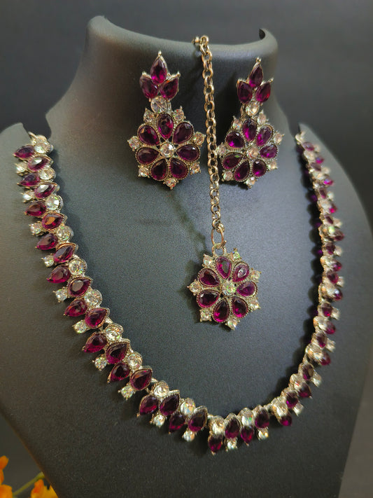 Ruby Diamond Necklace Set with Earrings & Maang Tikka