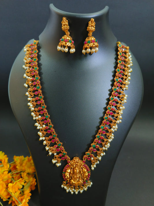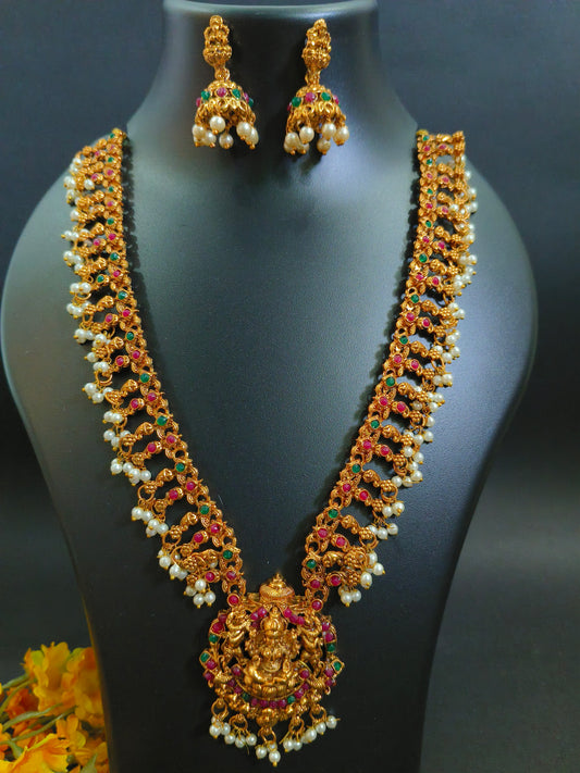 Traditional Jadau Kundan Long Necklace Set - Lakshmi Design with Pearls