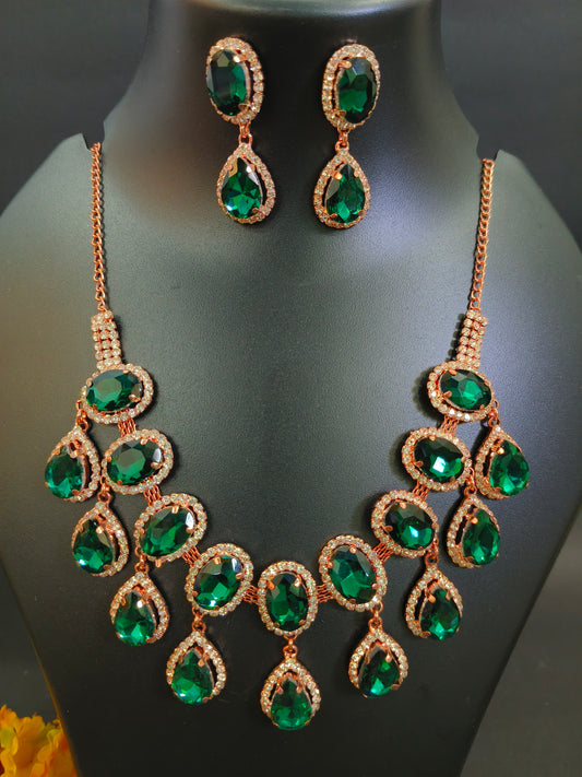 Emerald Green Teardrop Necklace Set - Rose Gold Plated with Crystal Accents