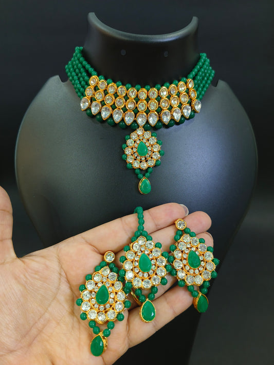 Green Kundan Beaded Choker Necklace Set - Traditional Indian Jewelry