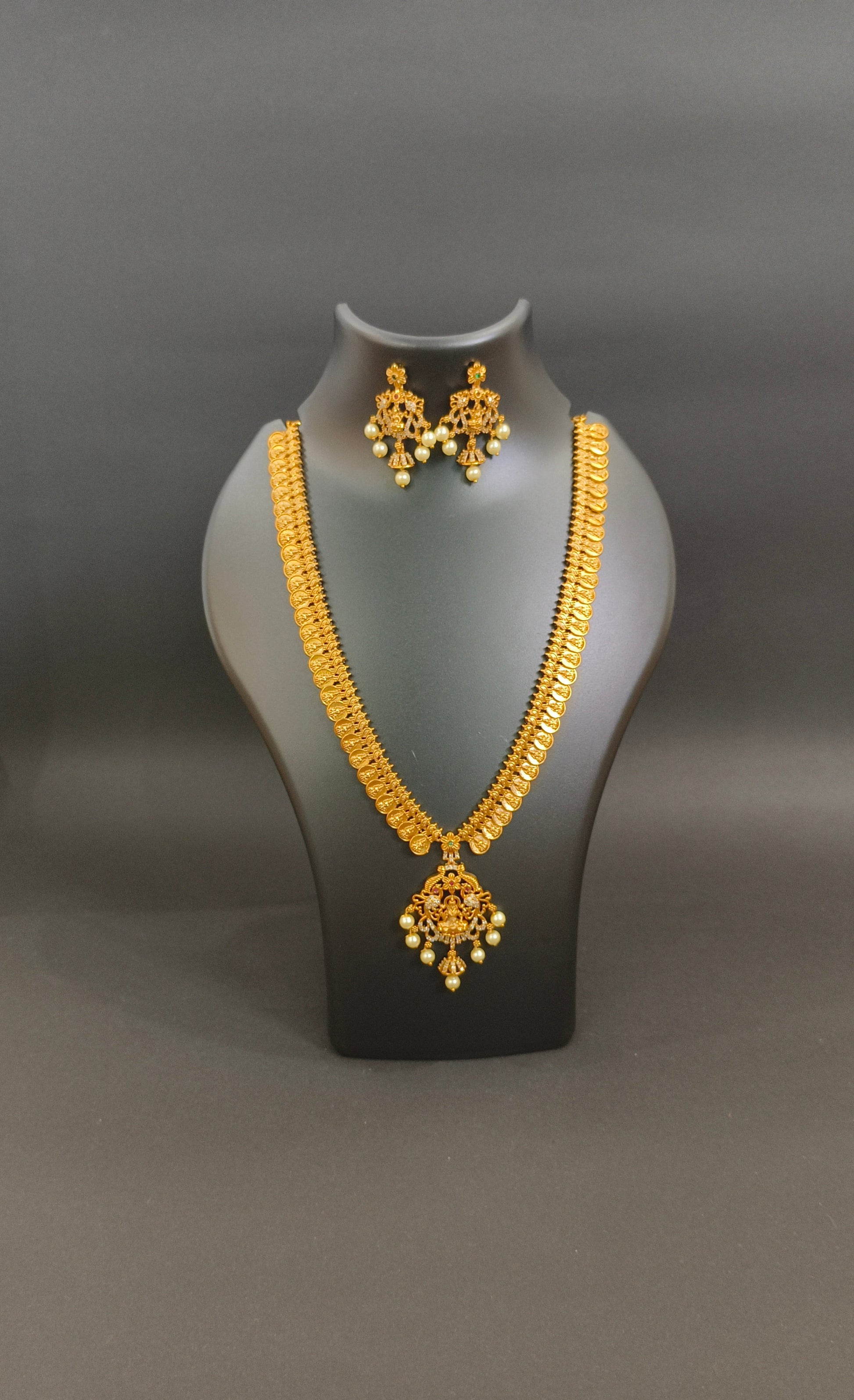 This exquisite necklace set features a long, cascading design made up of traditional Indian coins, adorned with intricate gold-toned detailing. The central pendant is embellished with a vibrant floral motif and delicate pearl drops. The necklace is complemented by matching earrings with a similar design and pearl drops. The oxidized silver finish gives the set a rustic and antique look.