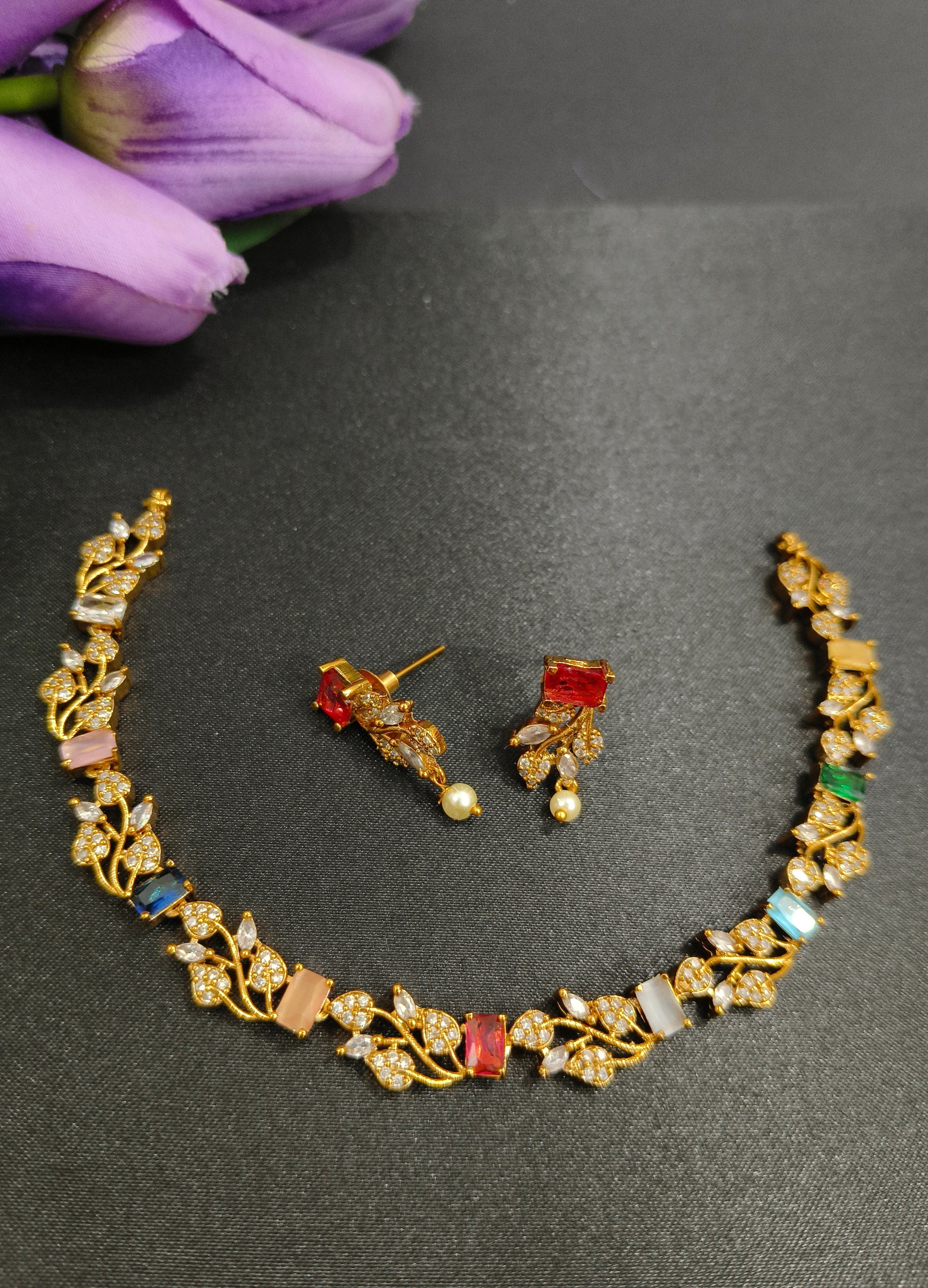 This stunning necklace set features a delicate gold-toned chain adorned with a vibrant array of colorful gemstones in rectangular shapes. The necklace is complemented by matching earrings with a similar design and delicate pearl drops.