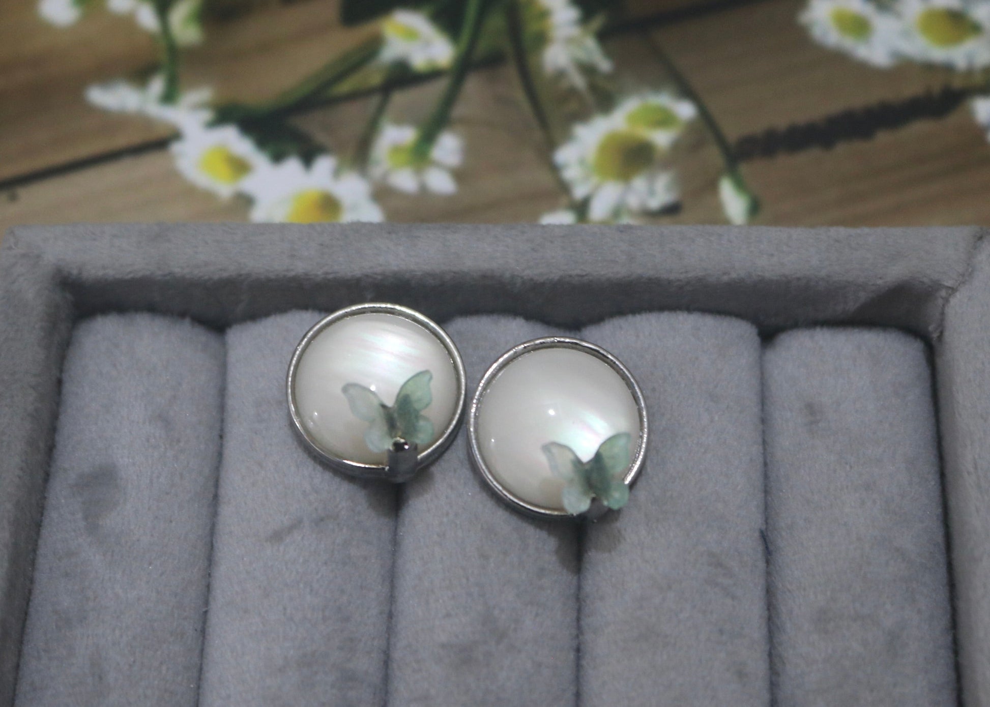 These stylish earrings feature a circular design with a white, iridescent centre. The earrings are crafted in a silver tone, complementing the white and iridescent colours beautifully.